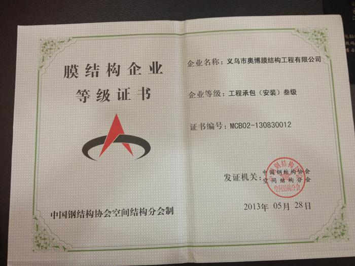 膜結(jié)構(gòu)企業(yè)等級證書
